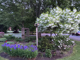 Blossoms of white, yellow and blue dot the Town Colors Garden, proudly planted and maintained by the Village Manor Garden Club for 12 years. This garden is in front and center of the Curry Building. The club is a member of the 7th District Federated Garden Clubs of NY. It has 13 active members who enjoy visiting gardens both near and far, having lunch together, and attending lectures featuring blossoms, birds, and other outdoor themes.